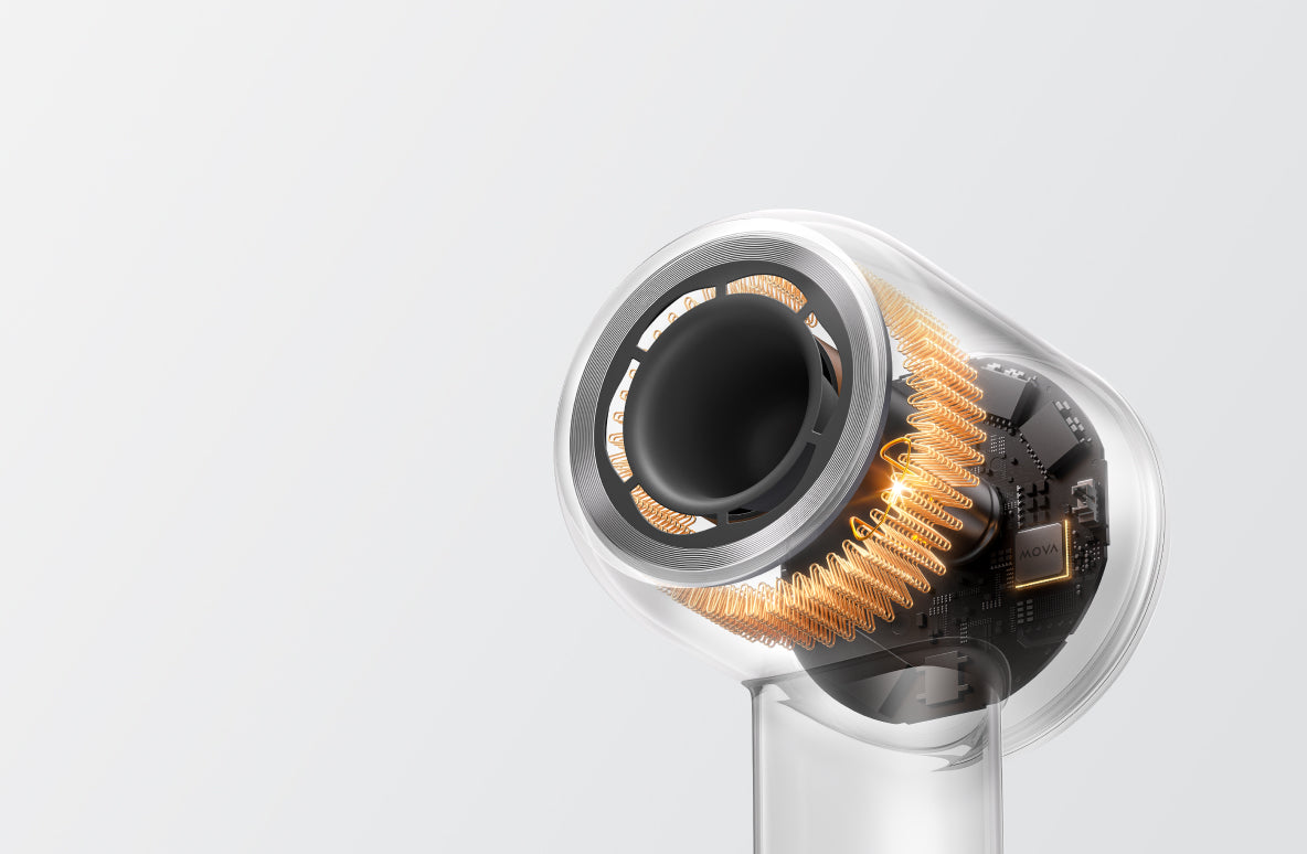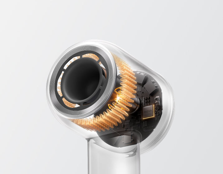 Shine 10 har også en kraftfuld højhastighedsmotor. Den børsteløse motor med 110.000 o/min. kombineret med den blomsterformede luftudgang giver en høj hastighed og en jævn luftstrøm, der kan blæse tungt vådt hår væk og nå ned til rødderne. Den kraftige luftstrøm under tryk fjerner hurtigt fugt fra hovedbunden.